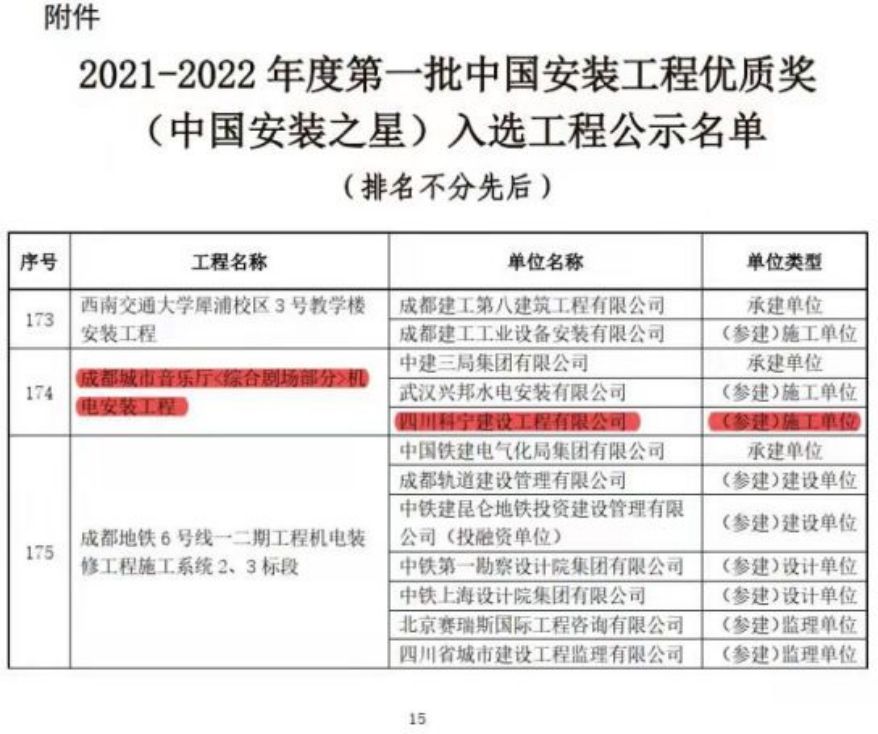 四川科寧建設工程有限公司參建的成都城市音樂廳(綜合劇場部分)機電安裝工程榮獲中國安裝工程優質獎(中國安裝之星)