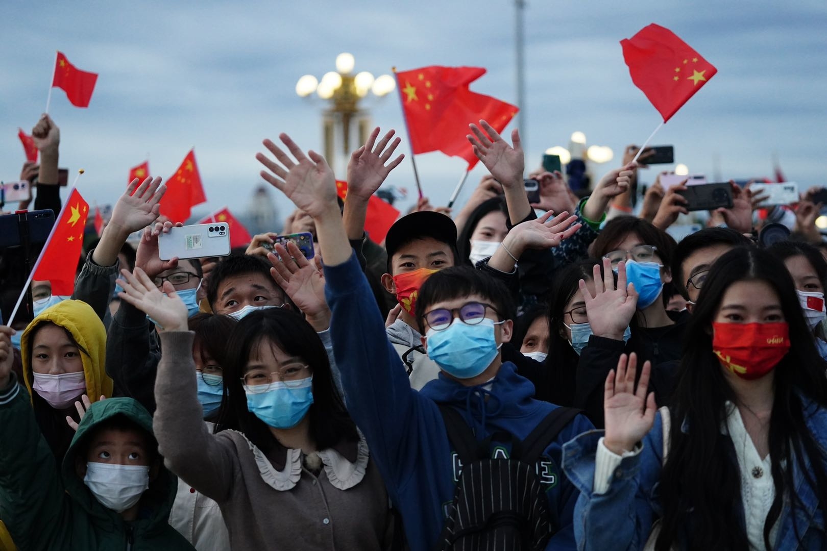 凌晨2點,華燈倒映下的長安街已經(jīng)十分熱鬧,來自四面八方的群眾陸續(xù)來到天安門廣場周邊。有的戴著“中國紅”口罩,有的手持小國旗,還有的在臉上印著國旗的圖案。大家自覺拉開安全距離,有序排隊等候,安檢入場,一切井然有序。