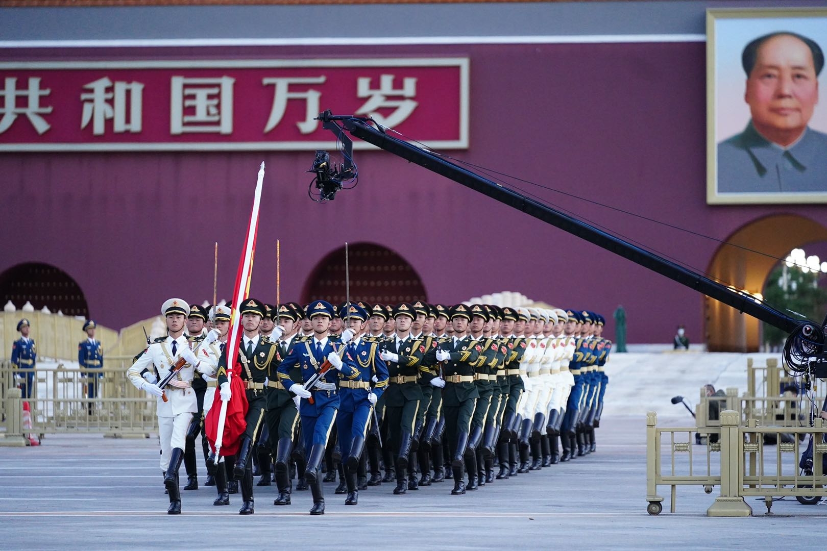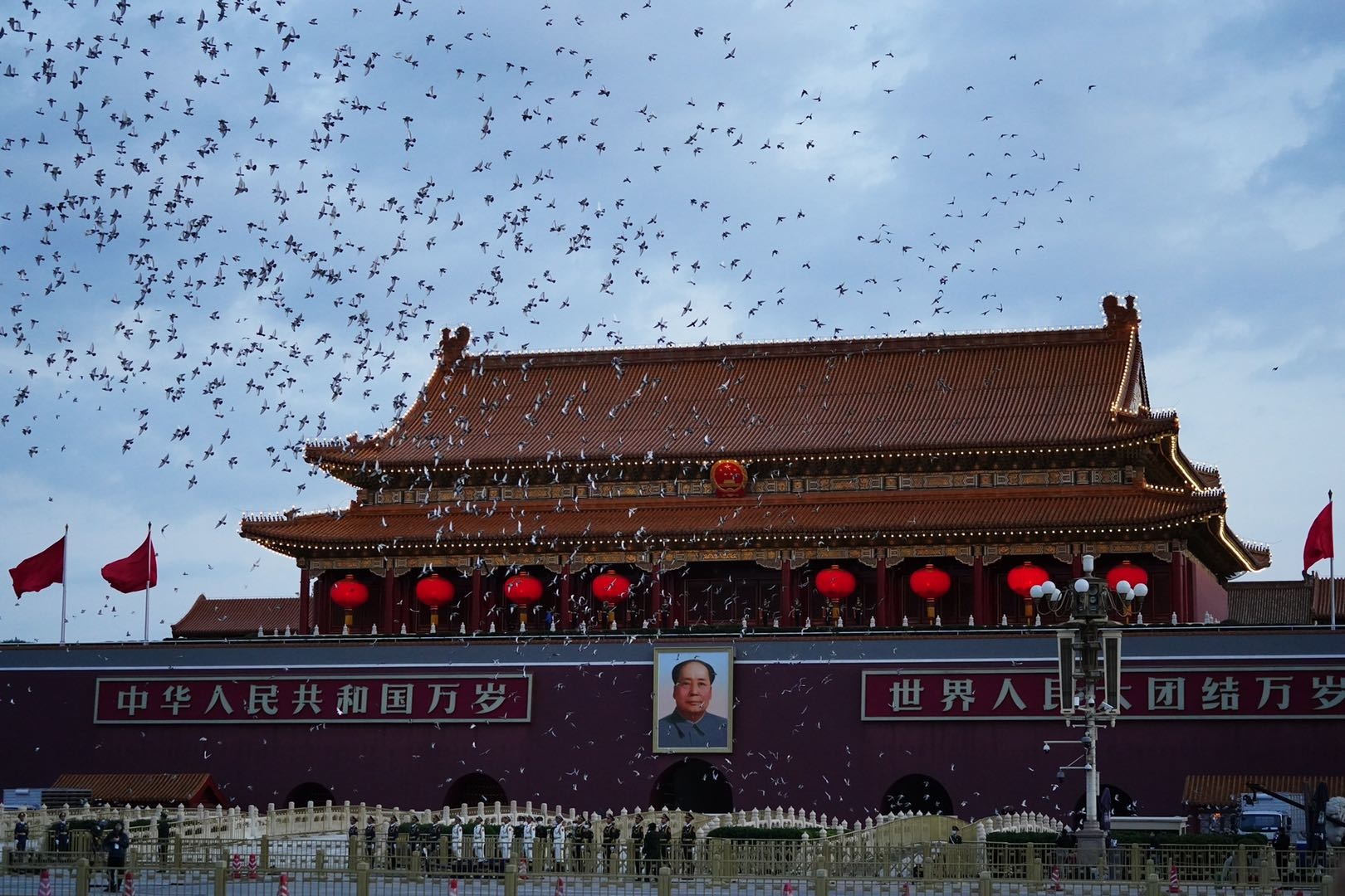 6時11分,禮畢,國旗升至旗桿頂端,萬羽和平鴿翱翔天空,繞著廣場盤旋,在軍樂團《歌唱祖國》的樂曲中,人們情不自禁地高呼“祖國萬歲!”“我愛你祖國!”大家久久不愿離去,有的學(xué)生敬禮致敬,有的鼓掌歡呼,還有人流下了激動的淚水。