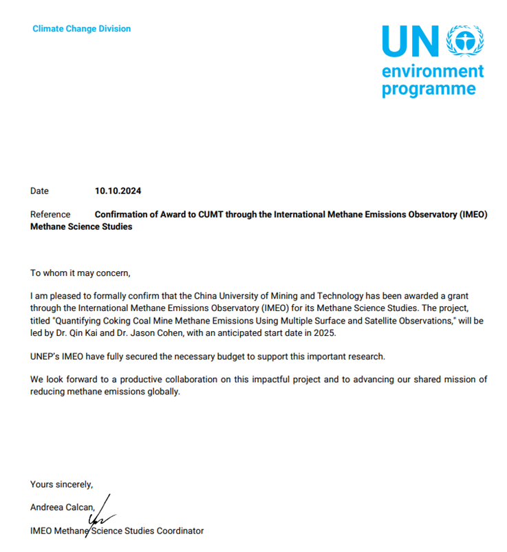據(jù)悉,聯(lián)合國環(huán)境規(guī)劃署UNEP通過其直屬的國際甲烷排放觀測站(IMEO)向全球征集甲烷排放監(jiān)測、評估及預警方面的科研項目申請。截至2024年2月,UNEP在全球范圍僅資助了25項該類項目,包括美國哈佛大學、美國斯坦福大學、德國不來梅大學等知名研究機構(gòu)。此次中國礦業(yè)大學成為中國第一個獲批項目,是源于中國礦業(yè)大學秦凱教授和Jason Cohen教授共同領導的碳排放與空氣質(zhì)量遙感團隊服務國家《甲烷排放控制行動方案》,聚焦煤炭行業(yè)甲烷量化研究,已獲批國家能源集團委托項目“煤礦甲烷反演量化服務”,并在《Atmospheric Chemistry and Physics》等國際權威期刊發(fā)表相關論文,提出了協(xié)同衛(wèi)星遙感與地面觀測的甲烷排放反演新方法,初步建立了單個煤礦尺度的甲烷排放清單。