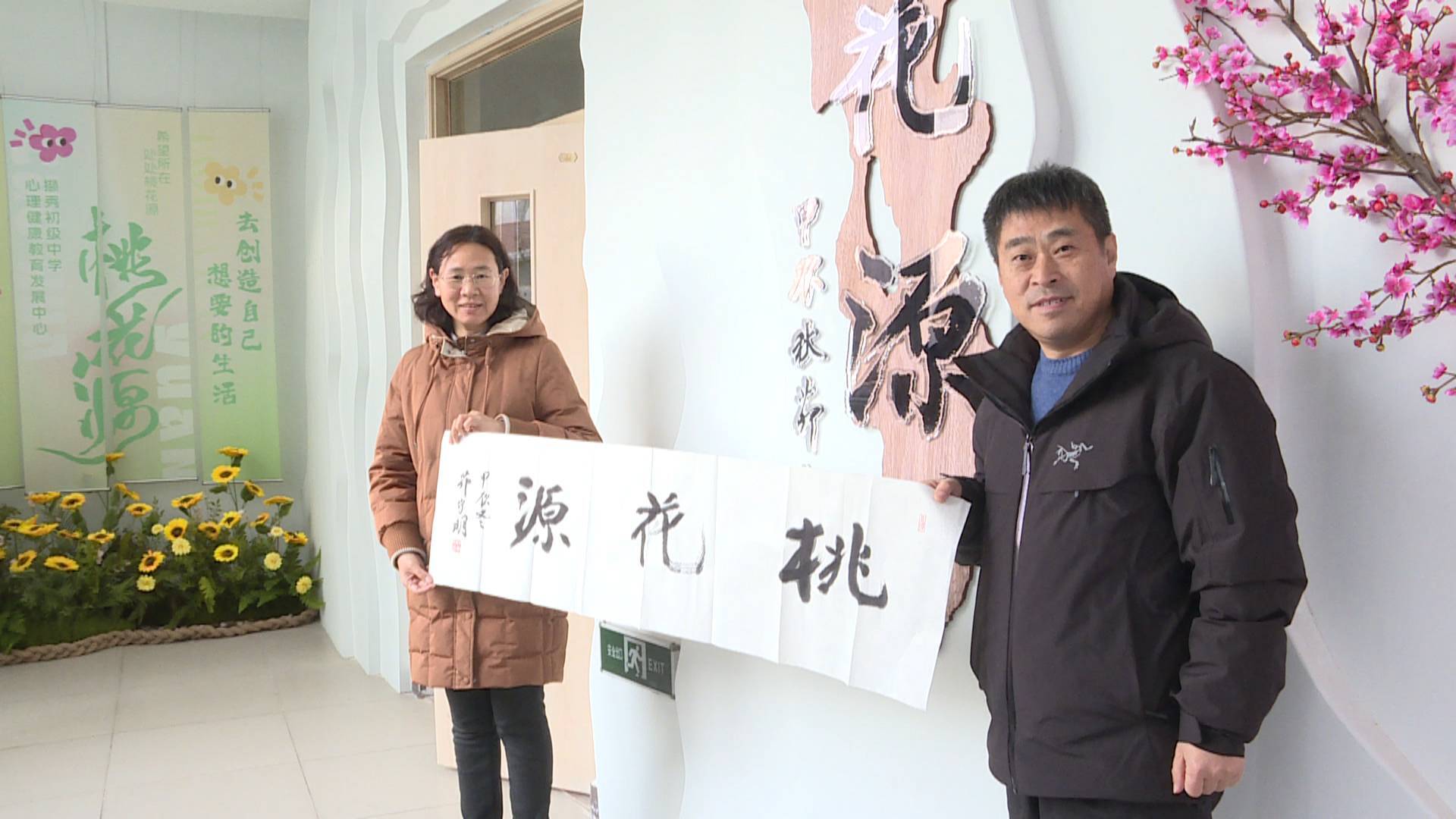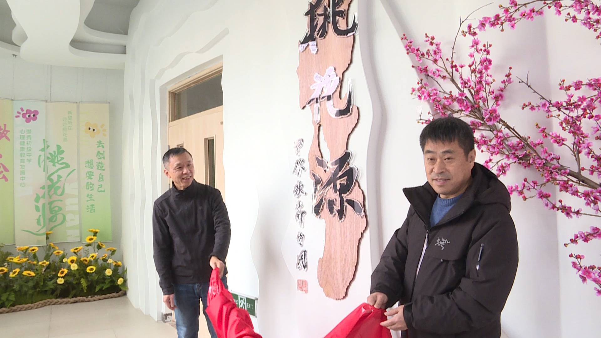 徐州市擷秀初級中學(xué)校長陳雷和徐州市知名書法家茆守明共同為“桃花源”心理健康發(fā)展中心揭牌。“桃花源”心理健康發(fā)展中心的設(shè)計理念源于陶淵明筆下的桃花源,不僅有“白云繚繞、落英繽紛”的外部環(huán)境建設(shè),也有“包容、接納、尊重”的內(nèi)部服務(wù)內(nèi)容,是師生心靈休憩的“桃花源”。桃花源三個字由知名書法家茆守明親筆題寫。茆守明,國家高級美術(shù)師,中國書法家協(xié)會會員,現(xiàn)為徐州書畫院書法創(chuàng)作室主任。