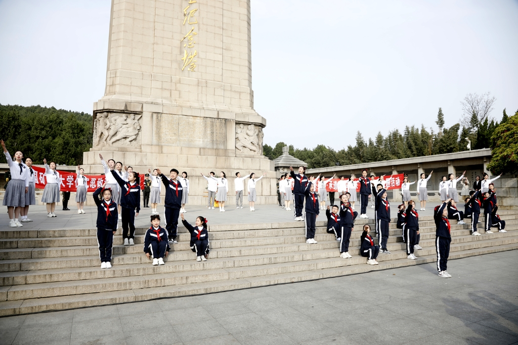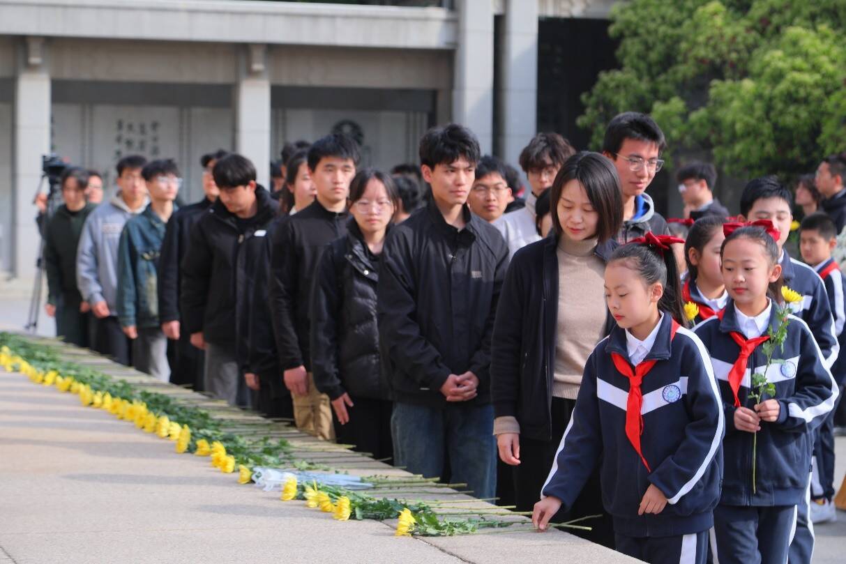 參與祭掃活動的師生代表在塔前敬獻鮮花,緩步繞塔瞻仰,向革命先烈深切寄托哀思。