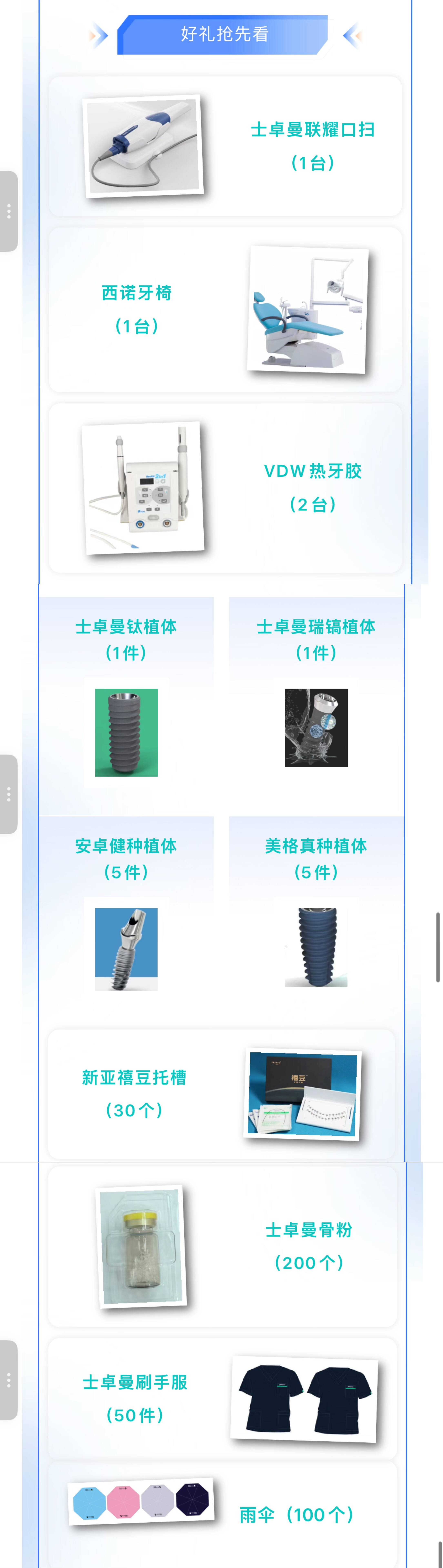 另有:西諾德光固化機(jī)(1臺)、便攜式牙片機(jī)(1臺)、八顆牙光固化機(jī)(1臺)、臺灣科頂牌高速手機(jī)(10臺)、西湖六代自鎖托槽(10個)、西湖藍(lán)膠套裝(20套)、西湖綠膠套裝(20套)、種植義齒(1顆)、半口義齒(2副)、哈雷保持器(4件)、鈷鉻合金支架(2件)、個性化基臺(20件)、全瓷冠(20顆)、南京丹郝斯漱口水套裝(50份)、徐州眾鴻漱口水套裝(50份)、兒童牙膏(40個)、茶具套裝(10件),等您來贏!