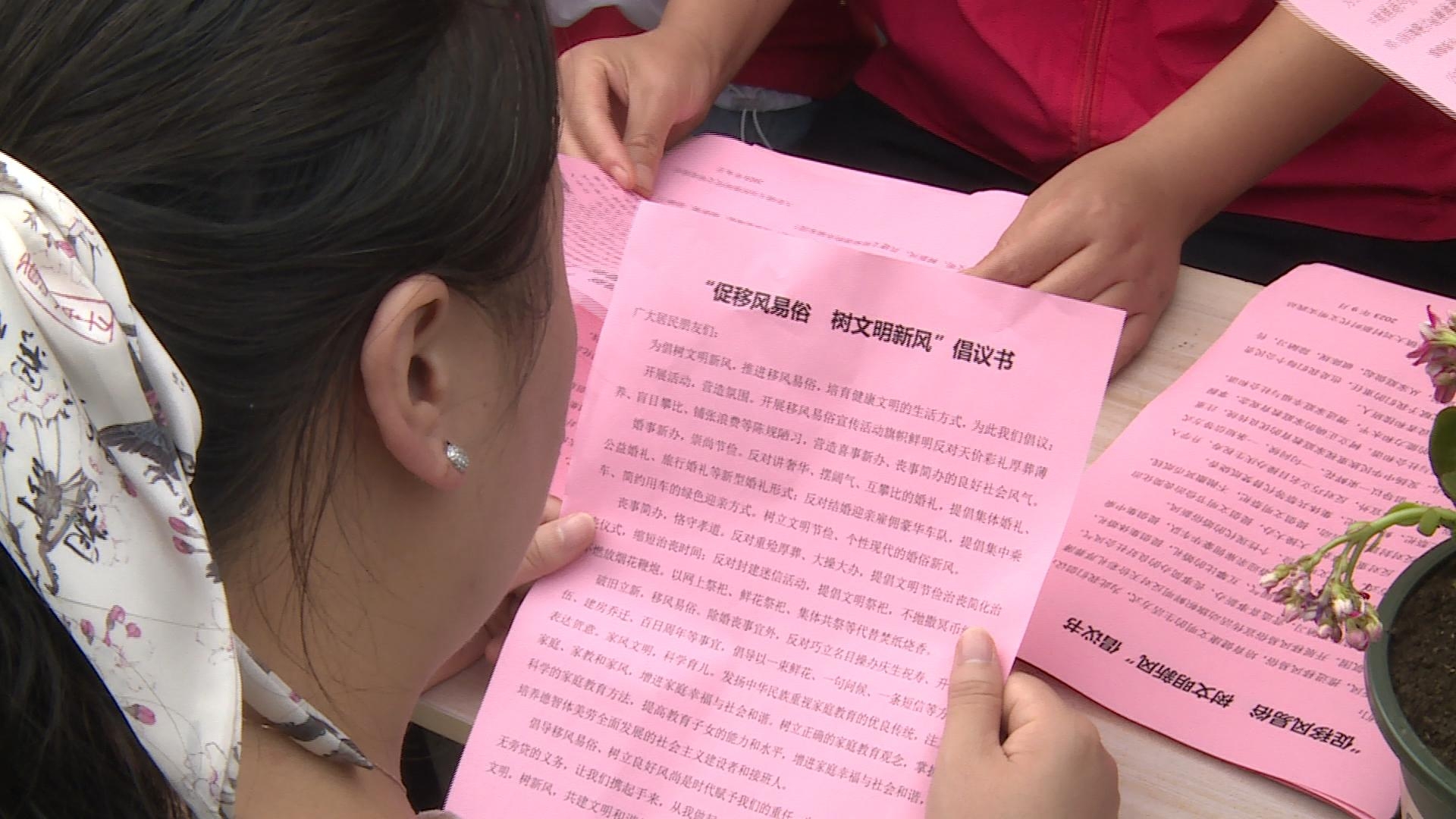像這樣的移風(fēng)易俗進(jìn)社區(qū)宣傳活動(dòng),大劉村每個(gè)月至少要舉行兩次。同時(shí),通過宣傳單發(fā)放、戶外橫幅懸掛和文化墻創(chuàng)作等方式,宣傳刊播移風(fēng)易俗標(biāo)語(yǔ)公益廣告,讓移風(fēng)易俗新風(fēng)尚家喻戶曉。真正起到引導(dǎo)廣大干部群眾正確理解、增進(jìn)共識(shí)、配合支持。
