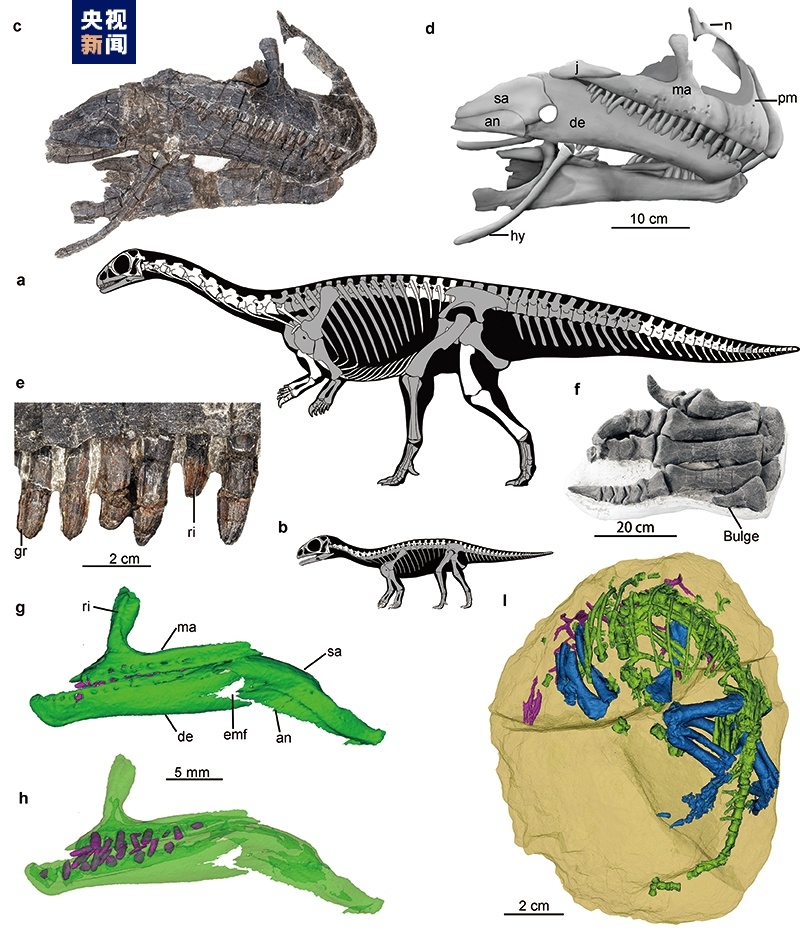 “守護黔龍”是一種中等體型早期蜥腳形類恐龍,成體體長約6米,體重約一噸。黔龍的幼體與成體存在一系列形態(tài)差異,如幼體齒骨所占下頜比例相對小,牙齒更少,以及更為垂直走向的前頜骨前緣。根據(jù)前后肢比例,成年黔龍可以兩足直立行走,但剛出殼的個體需要四足行走。研究顯示,黔龍可能與其他兩種蜥腳形類恐龍(大椎龍和鼠龍)一樣,存在多個個體在同一區(qū)域集群筑巢的行為。