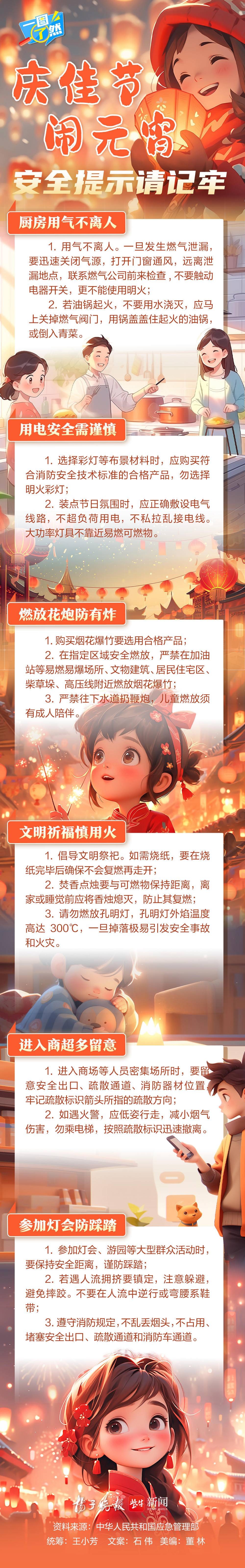 今天是元宵節(jié),節(jié)日期間各類促銷、節(jié)慶活動(dòng)增多,公共場所人員聚集,客流、物流密集,煙花爆竹燃放多,用火用氣用電增加,安全風(fēng)險(xiǎn)增加,容易發(fā)生火災(zāi)、踩踏等安全事故。慶佳節(jié)、鬧元宵,來自應(yīng)急管理部的安全提示請(qǐng)記牢。