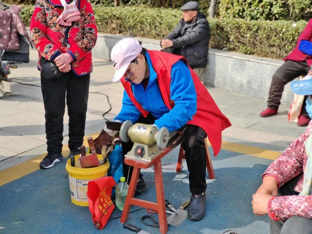 在活動現(xiàn)場,各個攤位前都排起了長隊,前蟠桃社區(qū)的“前大姐”志愿服務(wù)隊的磨菜刀服務(wù)項目每年都是最受歡迎的?!扒按蠼恪睒情L志愿者張大姐已是第二年參加活動了,今年她依然是氣定神閑,接到居民劉阿姨遞上來的菜刀后,先用電動磨頭粗磨,再用磨刀石精磨,不停翻轉(zhuǎn)刀面在磨刀石上來回摩擦,整個操作過程如行云流水。接到磨好的刀的劉阿姨高興地說:“去年咱社區(qū)組織的這項服務(wù)我沒趕上,這次聽到社區(qū)在廣播里預(yù)告了今天的活動,我一大早就來了,看這刀磨得多精細。咱前蟠桃社區(qū)組織的志愿服務(wù)活動真是太貼心了!”
