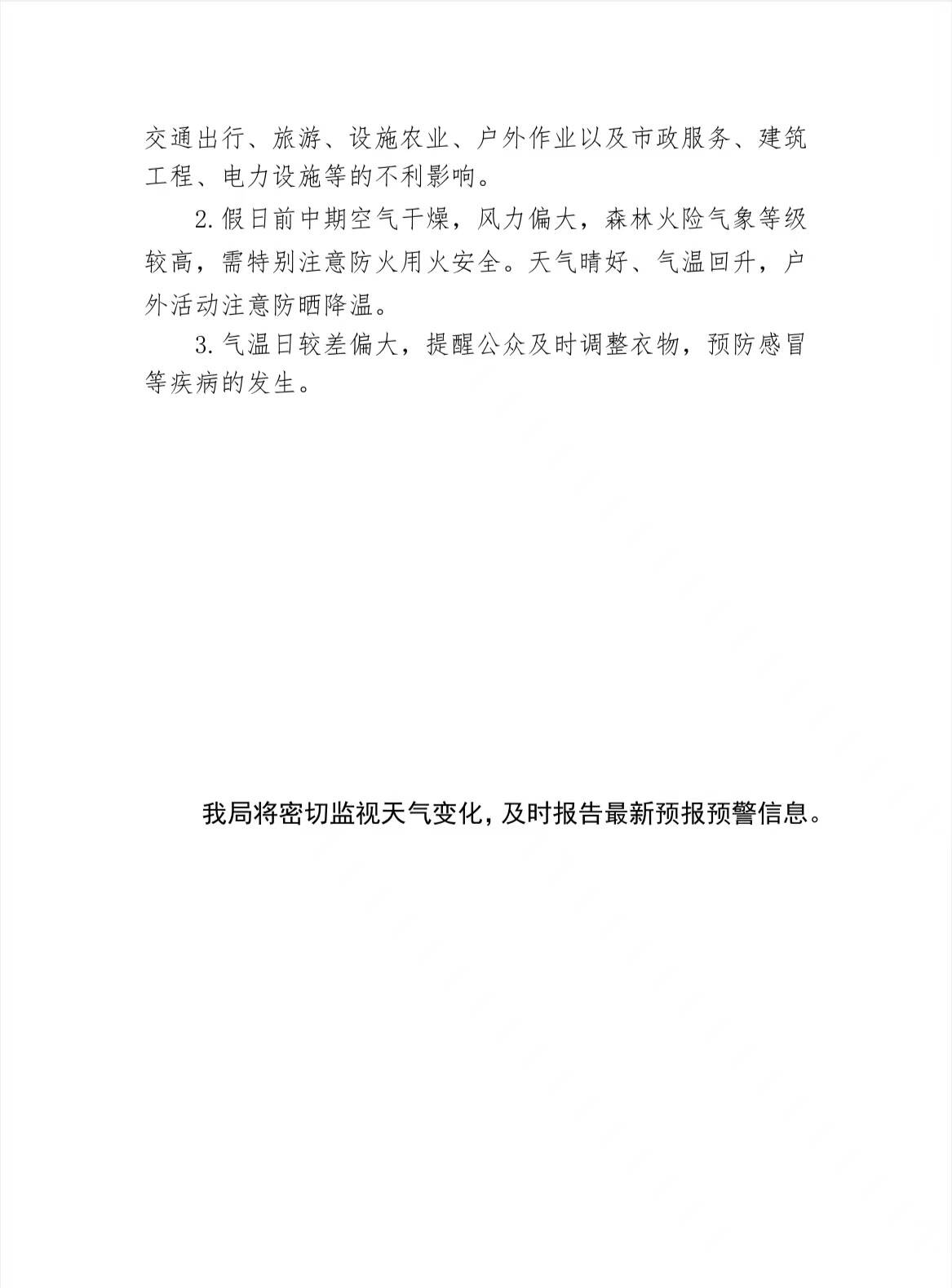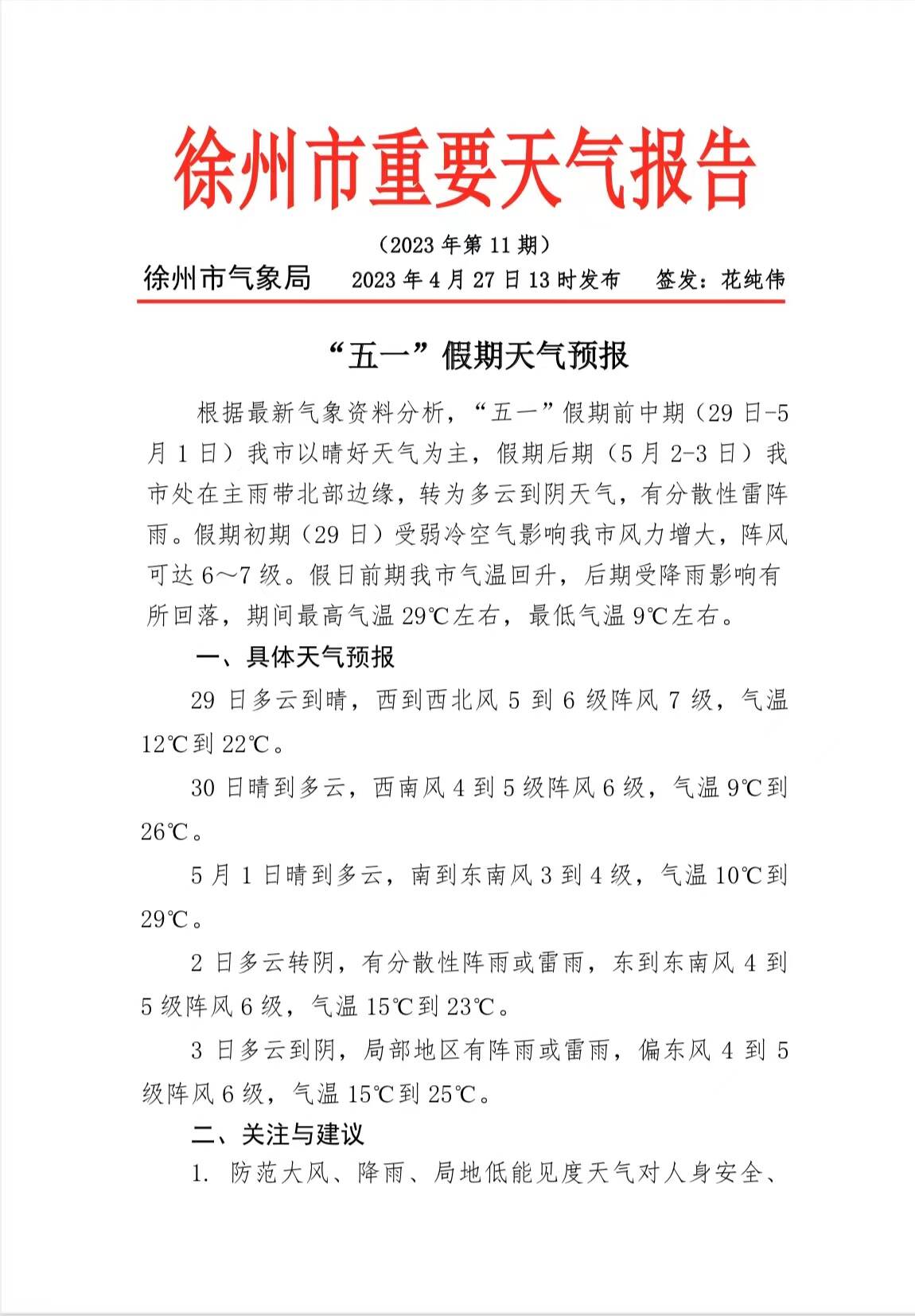 根據(jù)最新氣象資料分析, “五一”假期前中期(29 日-5 月 1 日) 我市以晴好天氣為主,假期后期(5 月 2-3 日) 我 市處在主雨帶北部邊緣,轉(zhuǎn)為多云到陰天氣, 有分散性雷陣雨。假期初期(29 日)受弱冷空氣影響我市風(fēng)力增大, 陣風(fēng) 可達(dá) 6~7 級(jí)。假日前期我市氣溫回升,后期受降雨影響有所回落,期間最高氣溫 29℃左右, 最低氣溫 9℃左右。