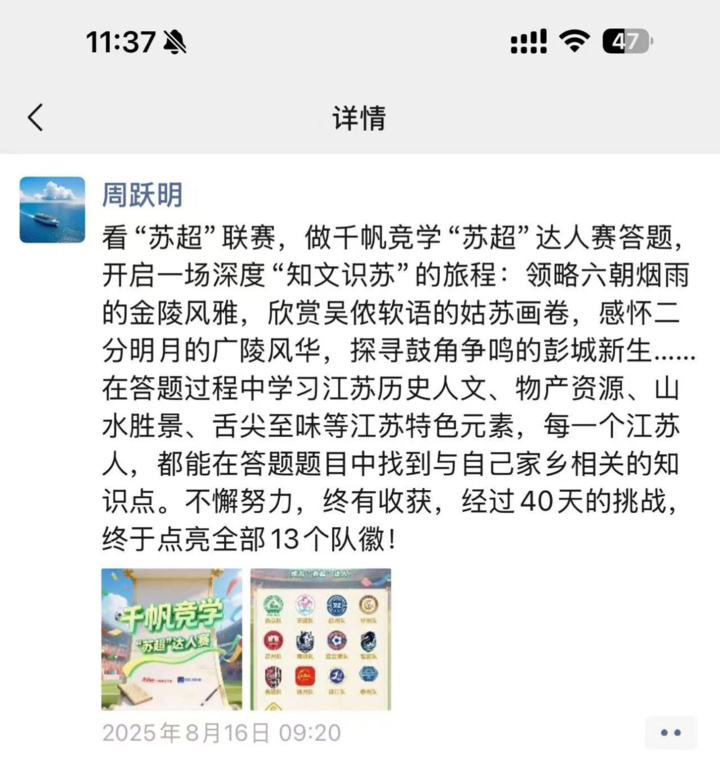 常州新運城市發(fā)展集團有限公司的陳穎漪,在近千次答題挑戰(zhàn)后集齊13枚隊徽,除此以外,她還在2025江蘇“學習達人”挑戰(zhàn)賽總決賽的賽場上摘得了“學習之星”稱號。她說:“球員為自己城市而戰(zhàn)的精神十分動人,能用知識點亮隊徽,仿佛我也參與了‘蘇超’,替常州贏得了一次次勝利。”這句話,道出了無數(shù)參賽者的心聲——即便不能親臨綠茵,也能在知識的賽場上為城市榮譽而戰(zhàn)。