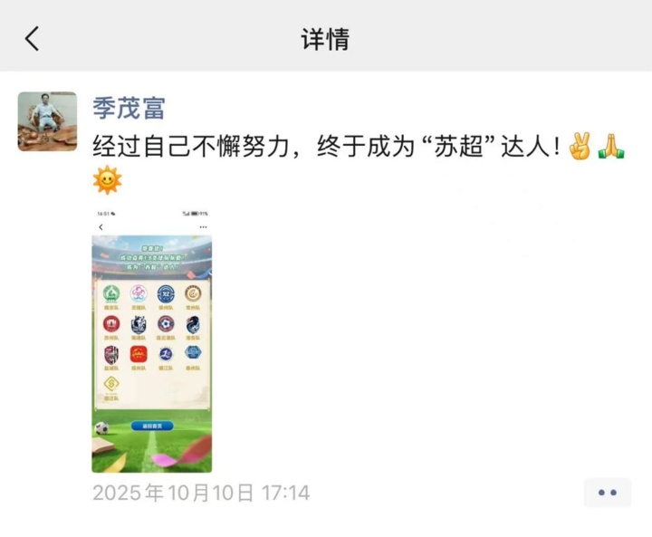 “經(jīng)過自己不懈努力,終于成為‘蘇超’達人!”10月10日,來自興化市安豐中心小學的季茂富在朋友圈記錄這一激動時刻。