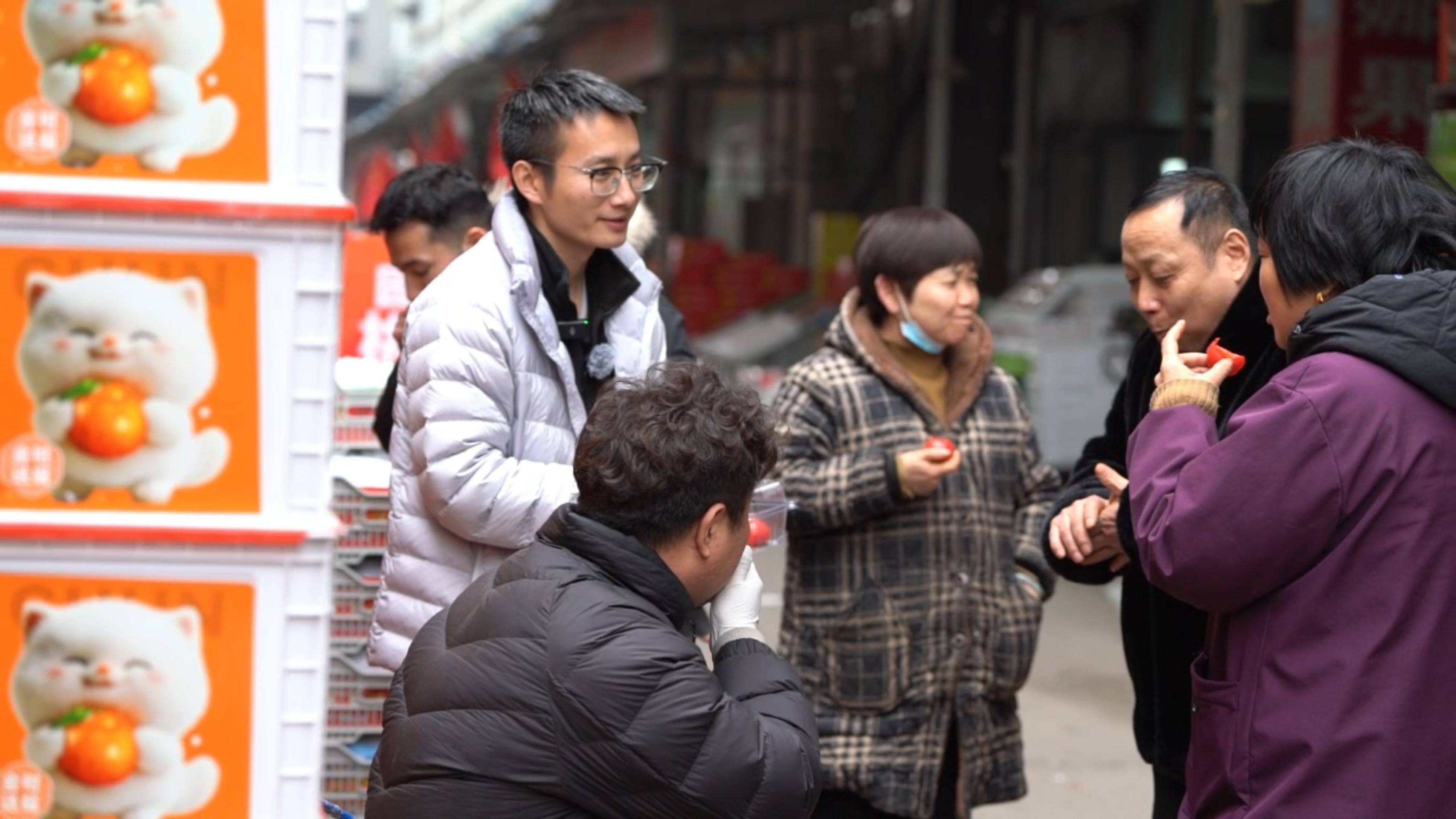 陳鎮(zhèn)在聽水果商反饋“喀柿紅”口感