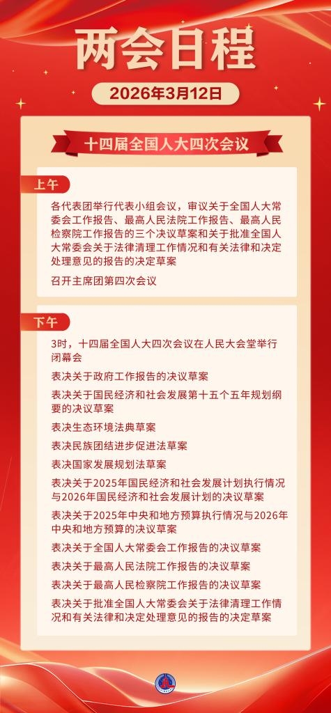 12日下午3時,十四屆全國人大四次會議在人民大會堂舉行閉幕會,表決關(guān)于政府工作報告的決議草案,表決關(guān)于國民經(jīng)濟(jì)和社會發(fā)展第十五個五年規(guī)劃綱要的決議草案,表決生態(tài)環(huán)境法典草案,表決民族團(tuán)結(jié)進(jìn)步促進(jìn)法草案,表決國家發(fā)展規(guī)劃法草案,表決關(guān)于2025年國民經(jīng)濟(jì)和社會發(fā)展計劃執(zhí)行情況與2026年國民經(jīng)濟(jì)和社會發(fā)展計劃的決議草案,表決關(guān)于2025年中央和地方預(yù)算執(zhí)行情況與2026年中央和地方預(yù)算的決議草案,表決關(guān)于全國人大常委會工作報告的決議草案,表決關(guān)于最高人民法院工作報告的決議草案,表決關(guān)于最高人民檢察院工作報告的決議草案,表決關(guān)于批準(zhǔn)全國人大常委會關(guān)于法律清理工作情況和有關(guān)法律和決定處理意見的報告的決定草案。