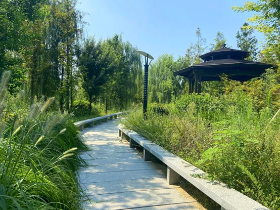 金奎生態(tài)休閑公園是以“海綿理念”為核心的無(wú)廢主題公園,一方面建設(shè)了4處海綿城市理念的景觀旱溪,利用旱溪周?chē)匦纹露纫M(jìn)行蓄水,并栽植水生植物形成特色的水溪景觀。另一方面設(shè)置多處無(wú)廢主題的宣傳區(qū)、垃圾分類(lèi)學(xué)習(xí)區(qū)、廢品再利用成果區(qū)等多處展示區(qū),讓“無(wú)廢”理念在公園內(nèi)隨處可見(jiàn)、隨時(shí)可學(xué)、隨心可感,結(jié)合游園體驗(yàn)宣傳無(wú)廢理念。