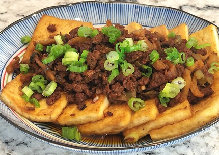 4、倒適量醬油在豆腐上,再把炒好的肉末倒在豆腐上;
