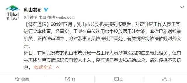 央廣網(wǎng)濟(jì)南10月27日消息,針對(duì)網(wǎng)傳山東省乳山市公務(wù)員投毒事件,乳山市人民政府新聞辦公室官方微博“乳山發(fā)布”14小時(shí)前發(fā)布“情況通報(bào)”,“情況通報(bào)”說,案件已移送檢察機(jī)關(guān),正依法審理中?!叭樯桨l(fā)布”發(fā)布的“情況通報(bào)”稱:2019年7月,乳山市公安機(jī)關(guān)接到報(bào)案后,對(duì)統(tǒng)計(jì)局工作人員于某進(jìn)行立案偵查。經(jīng)查實(shí),于某在單位飲用水中投放醫(yī)用注射液。案件已移送檢察機(jī)關(guān),正依法審理中,將對(duì)涉事人員依法從嚴(yán)查處,有關(guān)情況將依法依規(guī)對(duì)外公開。“乳山發(fā)布”“情況通報(bào)”還說,近日,有網(wǎng)民發(fā)布的乳山市統(tǒng)計(jì)局一名工作人員涉嫌投毒的信息與此相關(guān),但有關(guān)表述與查實(shí)情況確實(shí)有較大出入,存在明顯夸大和編造成分。請勿傳播不實(shí)信息。