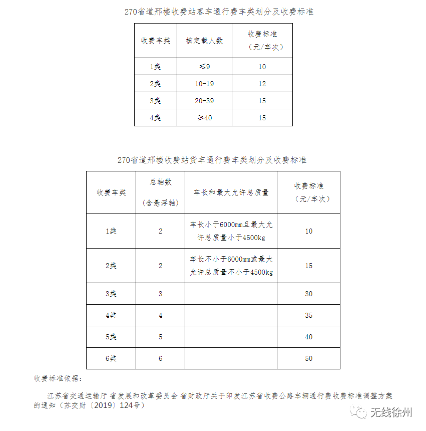 三、同意270省道邢樓收費站收費期限15年,收費標準執(zhí)行經(jīng)省政府同意的《省交通運輸廳省發(fā)展和改革委員會省財政廳關(guān)于印發(fā)江蘇省收費公路車輛通行費收費標準調(diào)整方案的通知》(蘇交財〔2019〕124號)中普通公路收費站同類收費標準。