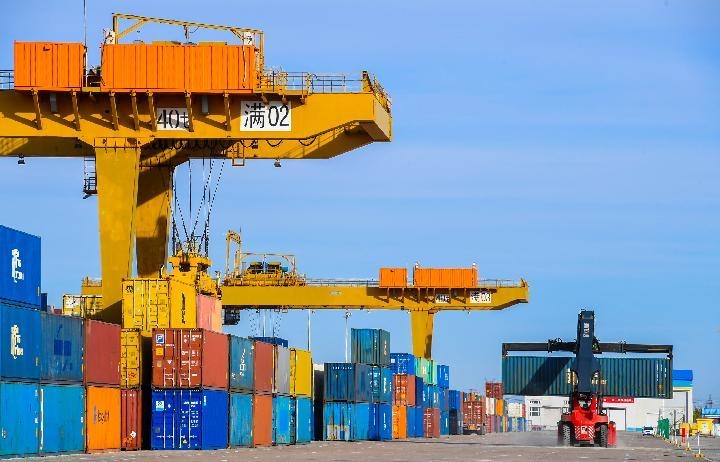 ↑作業(yè)車輛在滿洲里口岸鐵路集裝箱場內裝卸集裝箱。新華社記者彭源 攝