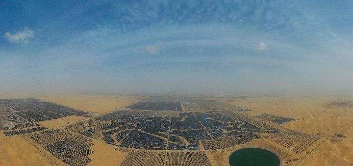 ↑內蒙古達拉特光伏發(fā)電應用領跑基地的“駿馬電站”。新華社記者劉磊 攝