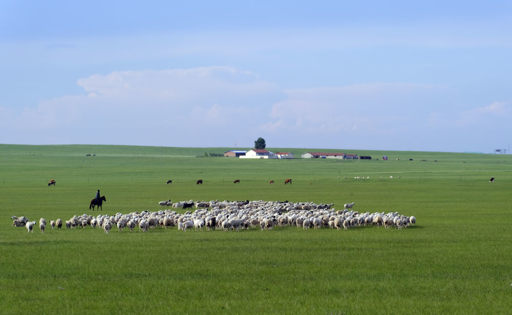 ↑內蒙古錫林郭勒盟烏拉蓋管理局境內的草原上,牧民在放羊。新華社記者賈立君 攝