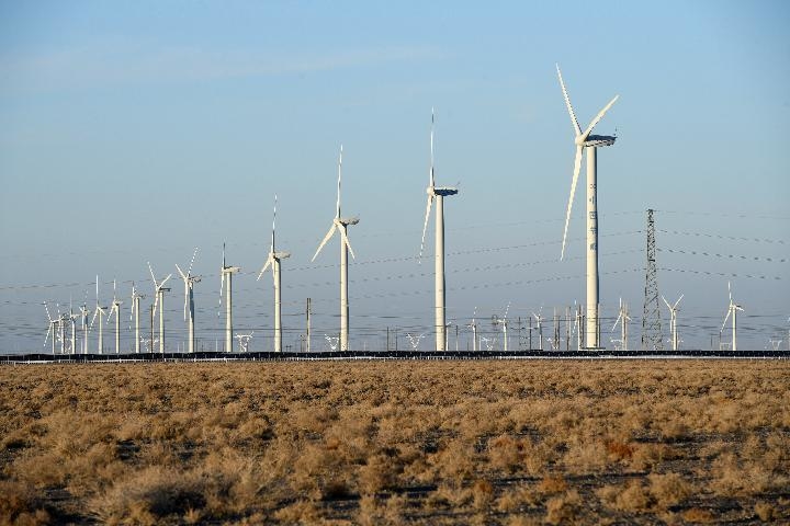 ↑中節(jié)能(甘肅)風力發(fā)電有限公司玉門昌馬風電場的風機。新華社記者范培珅 攝