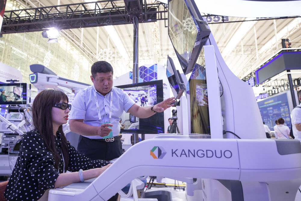在黑龍江省哈爾濱市舉辦的2022世界5G大會(huì)展廳里,參展商現(xiàn)場(chǎng)演示5G遠(yuǎn)程手術(shù)機(jī)器人(2022年8月10日攝)。新華社記者 張濤 攝