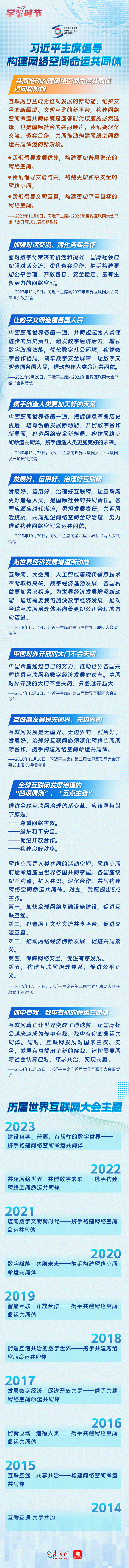 自2014年首屆世界互聯(lián)網(wǎng)大會舉辦以來,習(xí)近平主席或親臨現(xiàn)場發(fā)表主旨演講,或視頻致辭,或向大會發(fā)來賀信,以不同形式關(guān)心大會的舉辦。習(xí)近平主席的講話、賀信始終貫穿著一個理念主張——構(gòu)建網(wǎng)絡(luò)空間命運共同體。讓我們一同學(xué)習(xí)習(xí)近平主席的重要論述,一同回顧“烏鎮(zhèn)十年”。