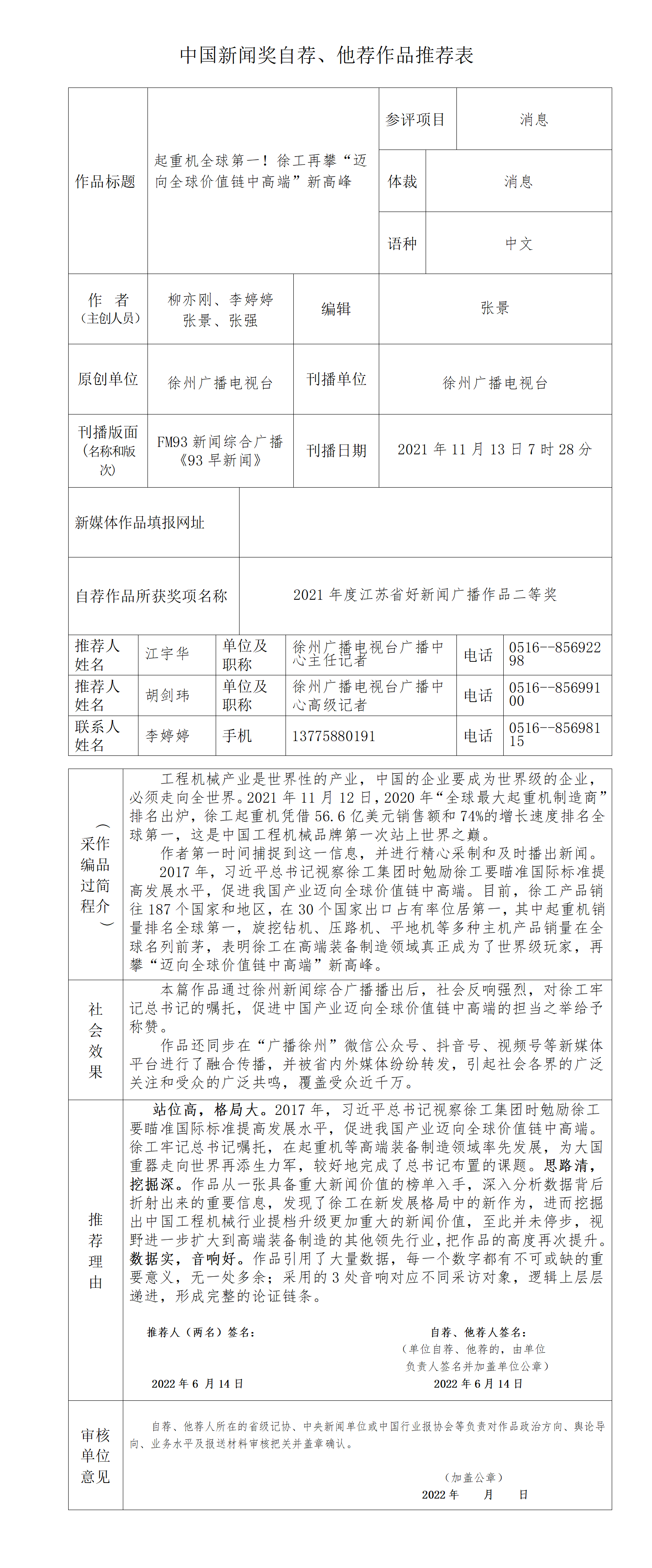 廣播消息《起重機(jī)全球第一!徐工再攀“邁向全球價(jià)值鏈中高端”新高峰》擬按自薦(他薦)方式參評(píng)第三十二屆中國新聞獎(jiǎng)。根據(jù)《中國新聞獎(jiǎng)評(píng)選辦法》,相關(guān)材料現(xiàn)在淮海網(wǎng)進(jìn)行公示,公示時(shí)間為2022年6月7日—13日。歡迎社會(huì)各界監(jiān)督。