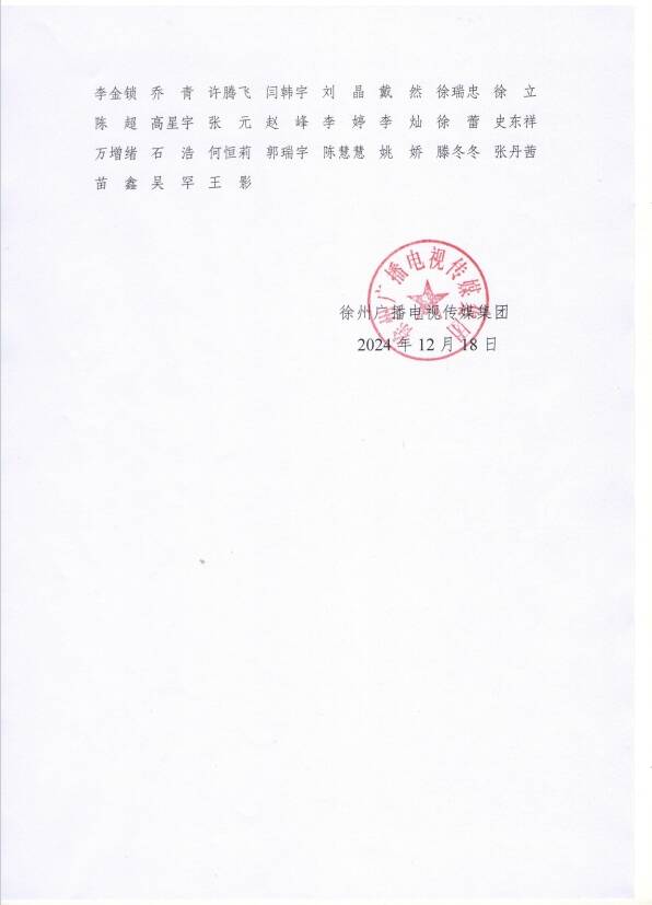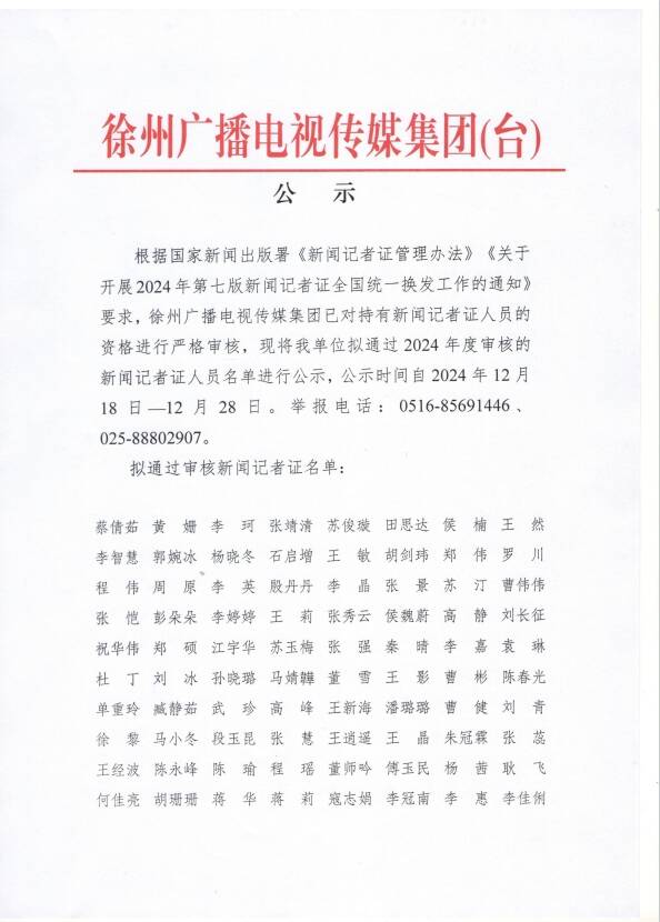 根據(jù)國家新聞出版署《新聞?dòng)浾咦C管理辦法》《關(guān)于開展2024年第七版新聞?dòng)浾咦C全國統(tǒng)一換發(fā)工作的通知》要求,徐州廣播電視傳媒集團(tuán)已對(duì)持有新聞?dòng)浾咦C人員的資格進(jìn)行嚴(yán)格審核,現(xiàn)將我單位擬通過2024年度審核的新聞?dòng)浾咦C人員名單進(jìn)行公示,公示時(shí)間自2024年12月18日-12月28日。舉報(bào)電話:0516-85691446025-88802907。