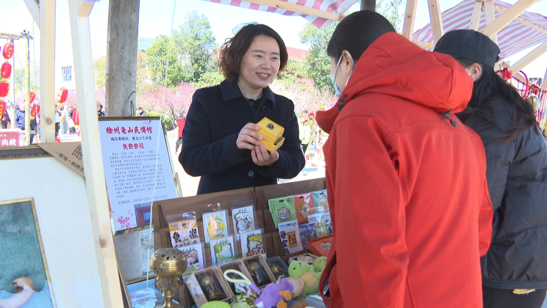 為了豐富游客的游玩體驗(yàn),促進(jìn)文旅消費(fèi),龜山探梅園積極引入了一系列新業(yè)態(tài)。文創(chuàng)市集上,各類特色文創(chuàng)產(chǎn)品琳瑯滿目,吸引了眾多游客駐足挑選。這些文創(chuàng)產(chǎn)品巧妙融合了龜山景區(qū)的文化元素,具有極高的紀(jì)念價(jià)值。