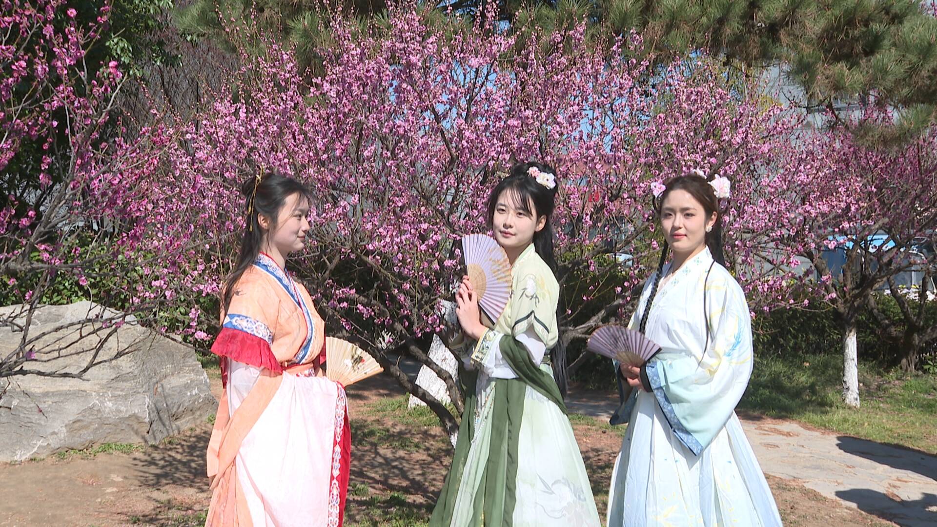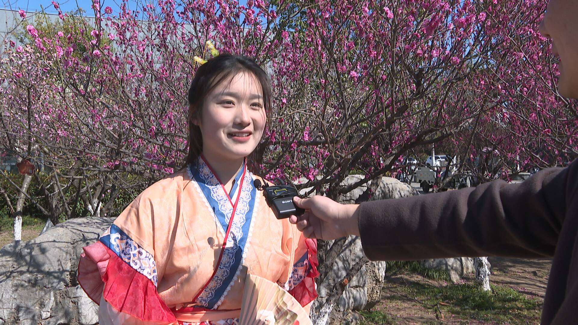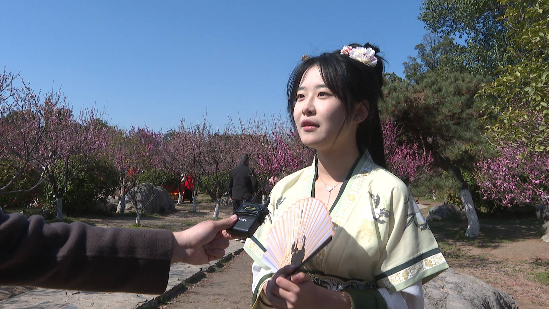 游客周士芬說(shuō):“在梅花開放的季節(jié),我們過(guò)來(lái)賞梅,而且今天人流量很大,梅花盛開得也比較好,在這里拍照會(huì)很出片,所以我專門穿著漢服過(guò)來(lái)拍照,想給我的春天留下不一樣的色彩?!?/p>
