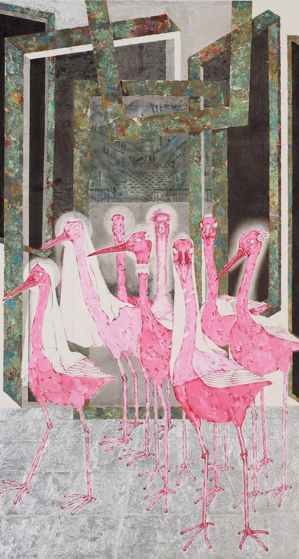 這場關(guān)于色彩的探尋之旅,要從2010年說起。那一年,趙方方考入山東藝術(shù)學院研究生,此前他專注于黑白水墨,但生活的絢麗色彩,沖擊著他的感官。在他眼中,傳統(tǒng)筆墨難以承載當下的美好,對色彩的渴求變得強烈。同時,開放的時代賦予他“大美術(shù)”視野,既汲取西方油畫、壁畫精華,又執(zhí)著探尋中國藝術(shù)的源頭活水。正是這種對本土色彩傳統(tǒng)的重新挖掘與對西方藝術(shù)的包容借鑒,共同澆灌出他獨特的藝術(shù)之花。2011年,《怡園驚夢》便是他大膽實踐的產(chǎn)物,主動“丟掉水墨”,拋開傳統(tǒng)筆墨系統(tǒng),僅憑色彩構(gòu)建畫面。這張轉(zhuǎn)型之作榮獲全國中國畫展最高獎,成為他堅定探索之路的重要基石。