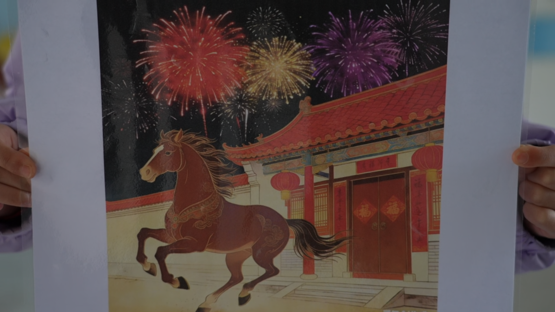 韓宸欣同學(xué)展示了自己的 AI 作品,一匹帶著花紋的棕色駿馬昂首向前,仿佛帶著好運(yùn)奔赴新一年。畫面里喜慶的小院、紅紅的燈籠、熱鬧的煙花,滿是新年的溫暖與希望,也寄托著對(duì)未來(lái)的美好祝福。