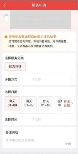 系統(tǒng)會(huì)顯示您所在區(qū)域附近的評(píng)估機(jī)構(gòu)列表供您選擇,點(diǎn)擊相應(yīng)評(píng)估機(jī)構(gòu)的“服務(wù)申請(qǐng)”按鈕,選擇評(píng)估方式,預(yù)約時(shí)間,點(diǎn)擊提交。當(dāng)您被評(píng)估為中度以上能力等級(jí)后,重復(fù)步驟二可領(lǐng)取消費(fèi)券。
