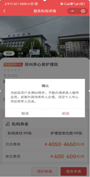 點(diǎn)擊“服務(wù)申請(qǐng)”后,如果頁面彈出一個(gè)要求添加老年人信息的對(duì)話框,點(diǎn)擊對(duì)話框中的“前往”按鈕,進(jìn)入“個(gè)人中心”頁面。