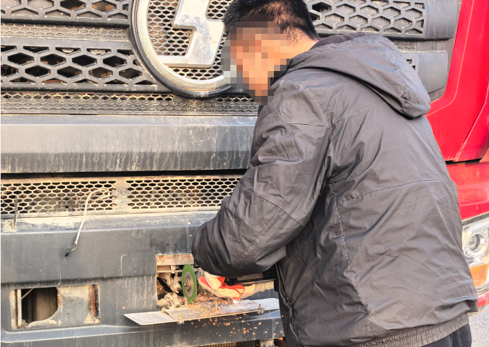 3月5日16時(shí)許,賈汪大隊(duì)卡口中隊(duì)民警在道路開(kāi)展常態(tài)化交通違法整治行動(dòng)時(shí),發(fā)現(xiàn)一輛貨車(chē)在車(chē)頭非法加裝射燈,而且車(chē)牌區(qū)域存在異常,執(zhí)勤民警立即依法對(duì)該車(chē)進(jìn)行攔截檢查。