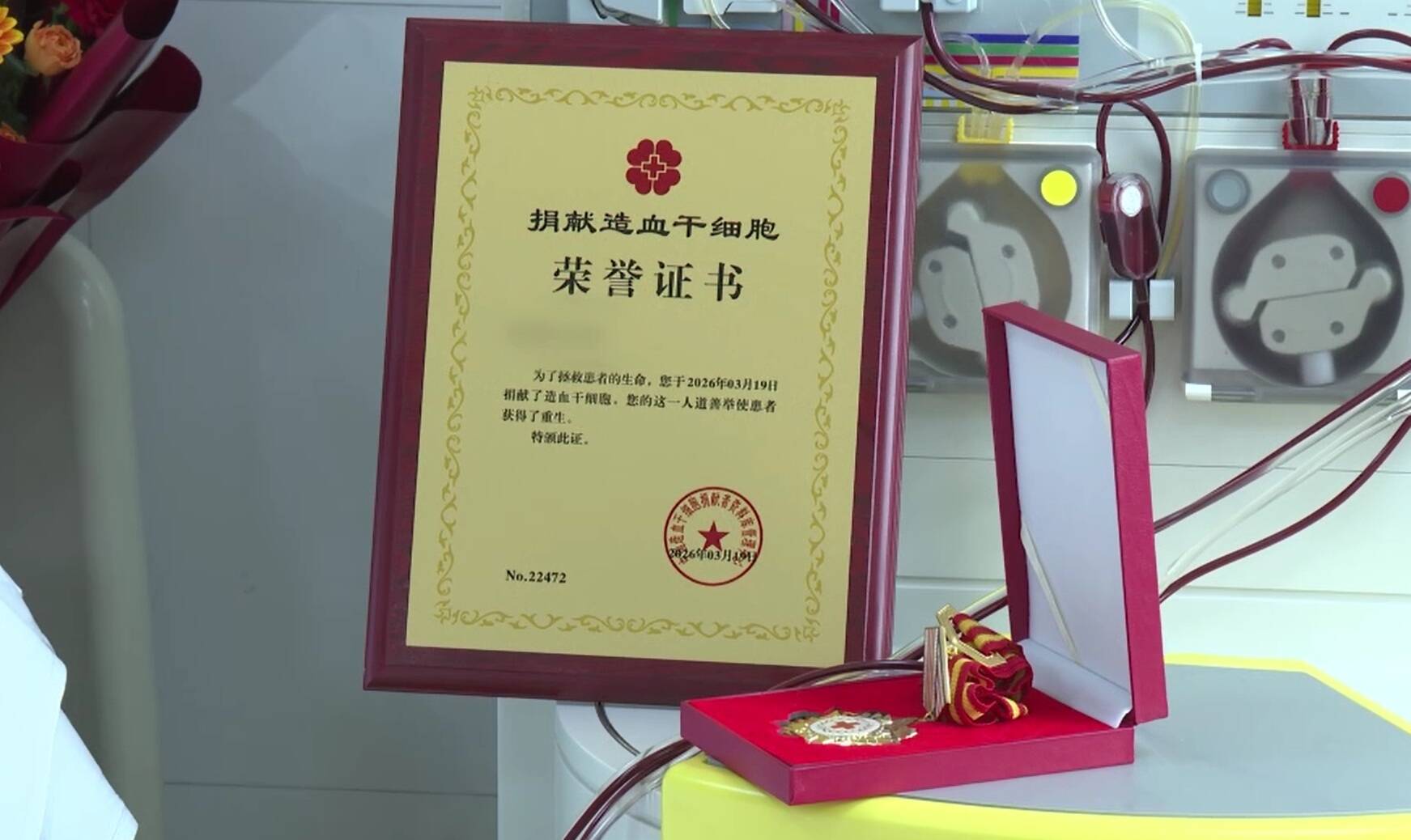 在采集現(xiàn)場(chǎng),市、區(qū)紅十字會(huì)工作人員為劉先生獻(xiàn)上鮮花、證書(shū)和獎(jiǎng)?wù)?,向他致以崇高敬意。?jīng)過(guò)約4小時(shí)的采集,221毫升造血干細(xì)胞混懸液被第一時(shí)間送往患者所在醫(yī)院,為患者帶去生命的曙光。