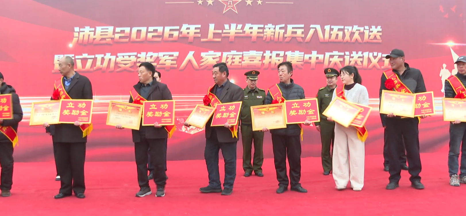 除了新兵歡送,活動現(xiàn)場還舉行了立功受獎軍人家庭喜報集中慶送儀式,工作人員向40個榮立三等功軍人家庭集中頒發(fā)了喜報和獎勵金,將黨和政府的關懷與敬意送到軍屬手中。