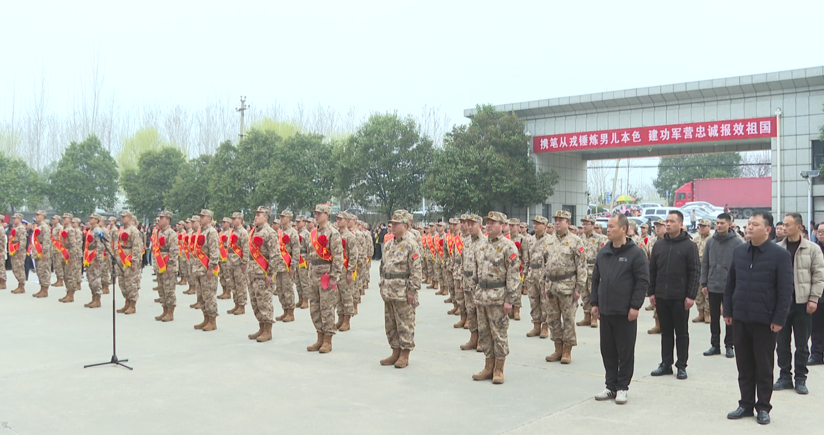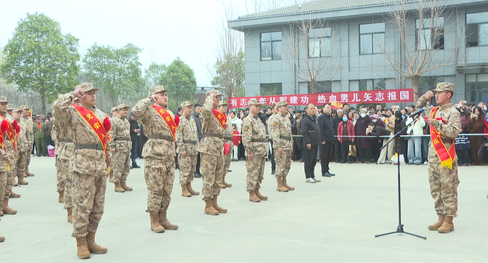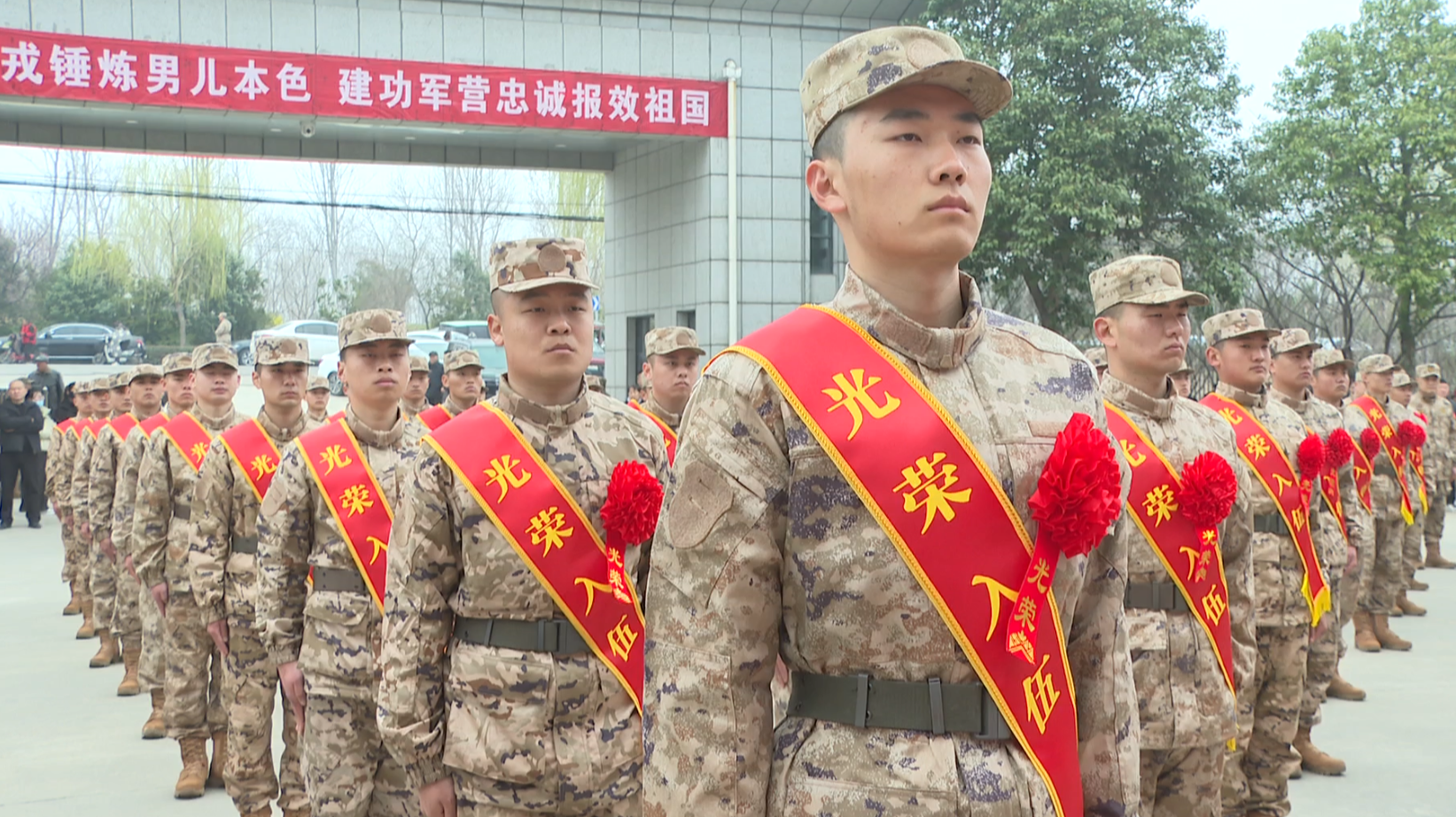 上午10點,沛縣民兵訓練基地內,新兵們依次佩戴上鮮艷的光榮紅花和綬帶,隨后全體新兵高舉右拳、集體莊嚴宣誓,用鏗鏘誓言表達投身軍營、守護家國的堅定決心。