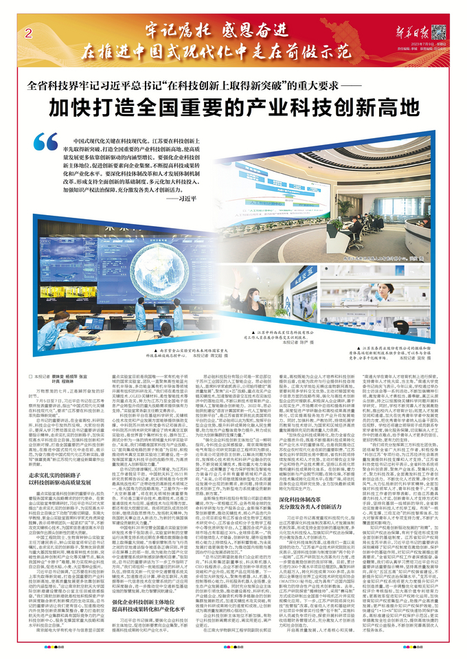 7月5日至7日,習(xí)近平總書(shū)記在江蘇考察并發(fā)表重要講話,指出“中國(guó)式現(xiàn)代化關(guān)鍵在科技現(xiàn)代化”,要求“江蘇要在科技創(chuàng)新上率先取得新突破”。