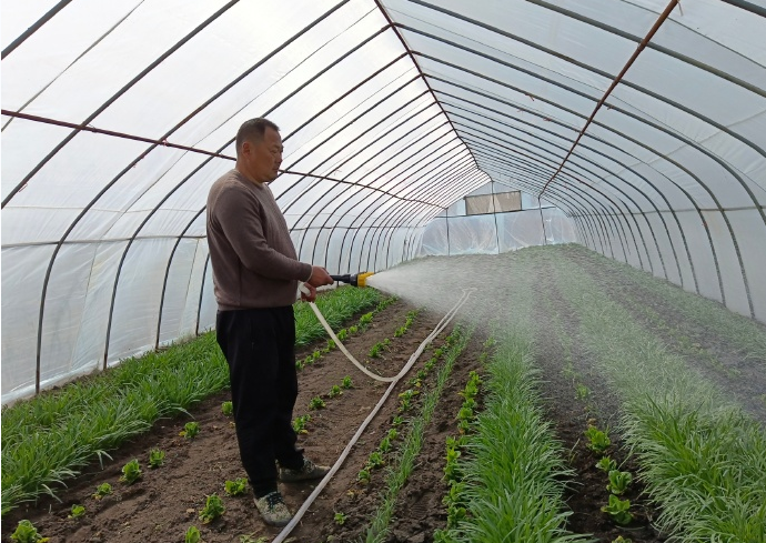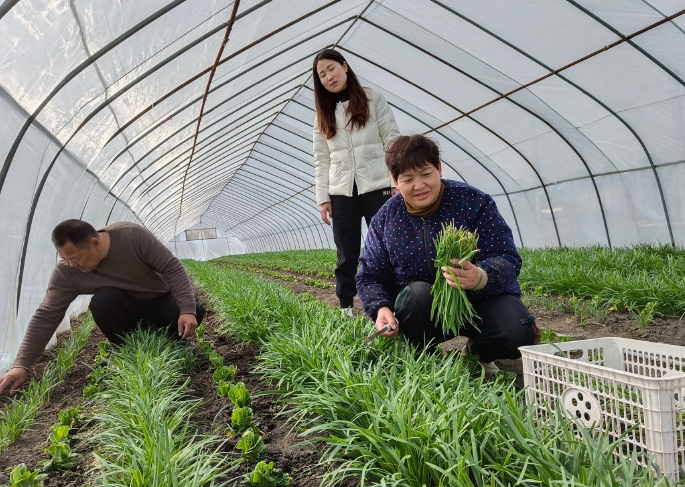 日前,記者來(lái)到位于盱眙縣太和社區(qū)的禾牧堂農(nóng)產(chǎn)品基地,走進(jìn)“蚊帳”大棚,里面溫暖如春,綠油油的韭菜正蓬勃生長(zhǎng)?;刎?fù)責(zé)人黃業(yè)坤正給韭菜澆水,黃業(yè)坤的妻子和兒媳小心翼翼地收割著韭菜。因?yàn)榛貏偨拥匠菂^(qū)兩個(gè)超市的訂單,稍后便有人登門(mén)來(lái)取。據(jù)了解,附近餐飲店負(fù)責(zé)人王明亮一大早就來(lái)過(guò)大棚,采購(gòu)了當(dāng)天需要用的韭菜。