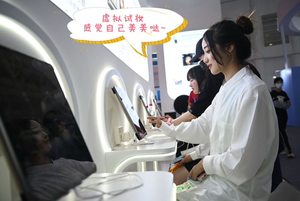 參觀者在使用美圖墨鏡進(jìn)行虛擬試妝