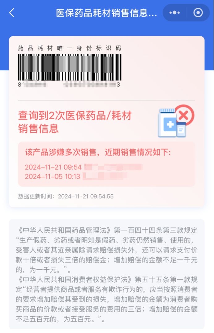界面如提示“查詢到多次醫(yī)保藥品/耗材銷售信息”并顯示出最近幾次的銷售記錄,該情況說明被查詢產(chǎn)品涉嫌多次銷售,群眾可依據(jù)此信息按照《中華人民共和國(guó)藥品管理法》、《中華人民共和國(guó)消費(fèi)者權(quán)益保護(hù)法》相關(guān)條款要求,向銷售此藥品的定點(diǎn)醫(yī)藥機(jī)構(gòu)索賠。