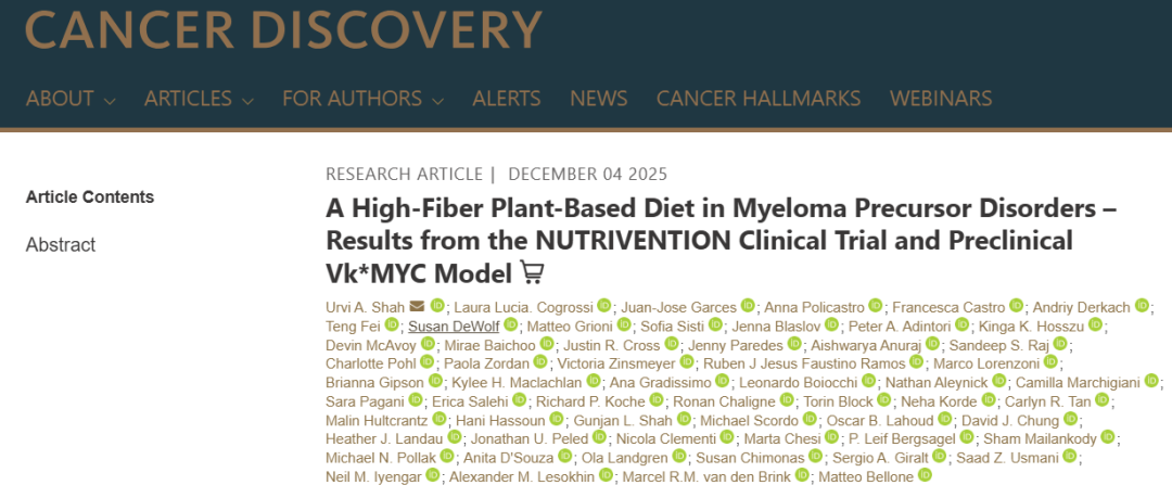 2025年發(fā)表在國際期刊《癌癥發(fā)現(xiàn)》(Cancer Discovery)的研究顯示,堅(jiān)持吃富含纖維的植物性飲食,可以顯著改善菌群、代謝和免疫,延緩骨髓瘤前體疾病進(jìn)展,也就是阻止癌前病變發(fā)展成癌癥。