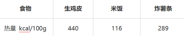 可以看到,即便是炸薯?xiàng)l這種在大眾認(rèn)知中“油多、熱量高”的食物,每 100 克的熱量也明顯低于雞皮。換句話說,同樣是 100 克,雞皮所提供的能量,比炸薯?xiàng)l還要高出約一半。