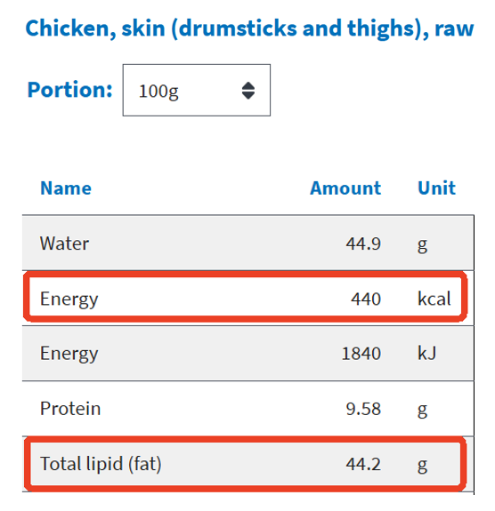 根據(jù)美國農(nóng)業(yè)部(USDA)的食物數(shù)據(jù)庫,每 100 克生雞皮的熱量大約在 440 千卡[1],而經(jīng)過烤制后,水分減少,熱量會(huì)進(jìn)一步濃縮。