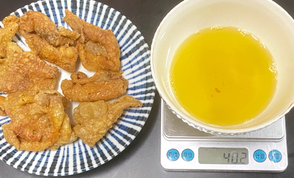 這些就是從雞皮里被逼出來的自身脂肪,這些被“炸”出來的油,直觀地告訴你雞皮到底有多“肥”。