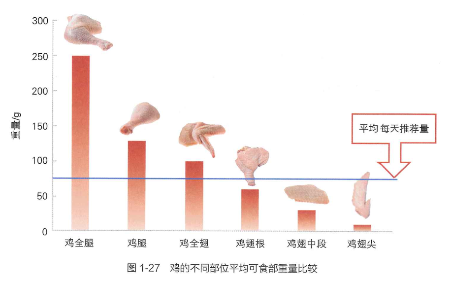 雞皮只占整體的很小一部分,大約 8%-12%?!吨袊用裆攀持改稀穂4]建議一天畜禽肉加起來吃 40~75g。即使只吃雞肉,一天最多也就 75g,即 6~9g 雞皮。
