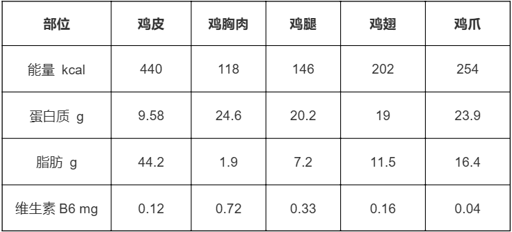 維生素 B6 是雞肉的突出成分,其含量比其他食物更高。而每 100g 雞皮中,維生素 B6 只有 0.12mg,僅為雞胸肉的 1/6。
