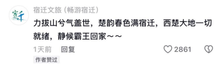 和何潤東在同一部劇中飾演虞姬的演員李依曉,也收到了宿遷文旅的隔空邀請: