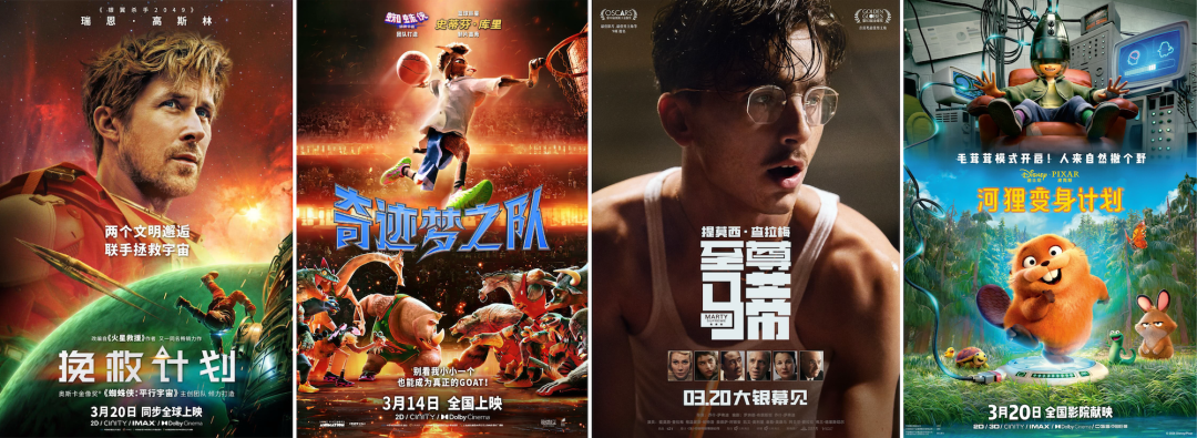 3月20日與北美同步上映的科幻電影《挽救計(jì)劃》講述太陽面臨危機(jī),一名宇航員在浩瀚宇宙中與外星伙伴攜手拯救地球的故事,截至目前國內(nèi)票房已達(dá)1.56億。此外,《河貍變身計(jì)劃》《非窮盡列舉》《至尊馬蒂》《奇跡夢之隊(duì)》等影片也持續(xù)受到市場關(guān)注,共同豐富了銀幕供給。